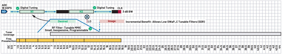 Dagens største SWaP-C- besparelser kommer fra å eliminere et helt frekvenskonverteringstrinn med mikser, RF-forsterkere, filtre og andre komponenter. En annen SWaP-C-fordel med dagens høyere IF-funksjon er at den direkte samplingen nå dekker det meste av LF til 5,5 GHz. Så du trenger ikke alltid en RF-tuner som dekker helt ned til 2 GHz. I mange tilfeller kan du slippe unna med en 5 GHz til 18 GHz RF-tuner. Å skifte den lave grensen for tuneren fra 2 GHz til 5,5 GHz virker lite, men er ganske betydelig ettersom det letter filtrering, frekvensplanlegging og nødvendig LO-område. Forbeholdet er at du fortsatt trenger å finne ut hvordan du skal dekke gapet mellom den første og andre Nyquist, som i en 6 GSPS ADC er i området 2,7 GHz til 3,3 GHz. En annen vurdering er behovet for svitsjede eller justerbare -antialiasing RF-filtre som lar deg veksle mellom den første og andre Nyquist- operasjonen.